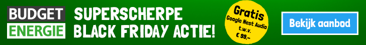 Ook bij Budget Energie hebben ze een Black Friday deal. Ze hebben het dit jaar groots aangepakt. Om te beginnen krijg je tot €150,- welkomstkorting en daarnaast krijg je een gratis Google Nest Audio t.w.v. van €99,-. Omdat dit nog niet gek genoeg is hebben ze ook een combikorting.